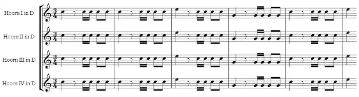 It is the first movement that shows off the horn section most dramatically, although not with the hunting calls he would later be known for in The Seasons or his Symphony No. 73, La chasse.[11] Here, Haydn begins with a military fanfare including all four horns:[12]