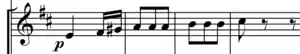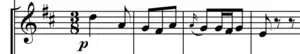 leading to a much more lyrical theme at measure 55. After a typical unison scale run, the exposition concludes with A major firmly established as the tonic. The development is concerned almost exclusively with Example 2. A general pause precedes the recapitulation, which besides reorienting the second subject group to D major, also mixes the subjects of the groups together, with special emphasis on Example 2. Haydn indicated the development, recapitulation and coda are to be repeated as a unit, but that repeat is normally ignored in modern performance.