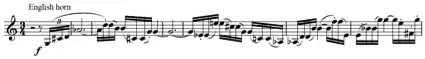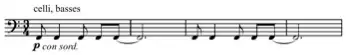 After the climax, the ostinato of the Passacaglia returns to D and the movement experiences a dénouement. It ends with a gradual recession of momentum and a brief recall of the lyricism of the previous Adagio. Here, solo winds take brief melodies over a now fragmented ostinato, as seen in the English horn solo at mm. 101–103 (Example 14). The movement closes with a repeated figure in the bass, seen fragmented in mm. 101–105, with celli in imitation (Example 15).