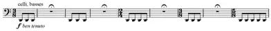 The opening movement is characterized by an incessant bass ostinato on a low F, which continues in a regular pattern throughout. The bass ostinato introduced here also becomes a unifying motive for four of the five movements (only the third movement does not contain a defined ostinato figure).