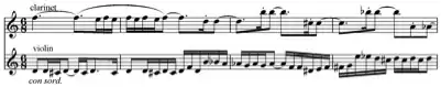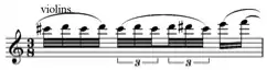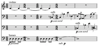 Additionally, Penderecki also puts added emphasis on the interval of the half step, the smallest unit of the chromatic scale, seen most prominently in the viola solo section. This half step, followed by a short rising chromatic figure, is described by Cindy Bylander as Penderecki's "sighing motive."[22]