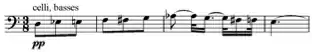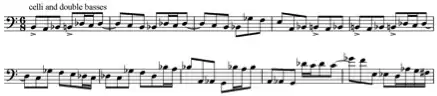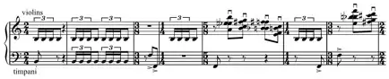 The low strings also begin a rhythmic pattern which can be found throughout the movement, often in higher voices (a similar procedure can be found in the second movement). A number of melodies in this finale also consist of an upwards tritone leap followed by a chromatic descent.