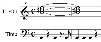 The first movement, which for the most part has the character of a march, features a motif consisting of an A major triad turning to A minor over a distinctive timpani rhythm. The chords are played by trumpets and oboes when first heard, with the trumpets sounding the loudest in the first chord and the oboes in the second.