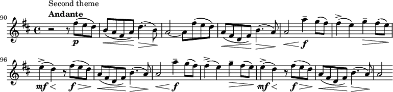 The energetic development section begins abruptly, with an outburst from the orchestra in C minor, but soon transitions to D minor. It runs seamlessly into the fortissimo recapitulation, whose atmosphere is completely different from its rather hesitant equivalent at the beginning of the exposition. At some point, the main theme of the movement is being restated. Tchaikovsky soon goes into something more nightmarish, which culminates in an explosion of despair and misery in B minor, accompanied by a strong and repetitive 4-note figure in the brass. This explosion concludes in a powerful note in the trombones marked quadruple forte, a rare dynamic mark intending the instrument to be played as loud as possible. This section ends with diminishing strains on the basses and brass, and is a section that truly reveals the pathos and upcoming emotions of the symphony. The movement concludes shortly after the recapitulation of the second subject shown above, this time in the tonic major (B major) with a coda which is also in B major, finally ending very quietly.