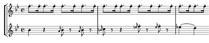 The second theme in B♭ major features dotted repeated notes in a solo oboe against jerky acciaccatura in the first violins. This is the "Hen" motif that gives the symphony its nickname, although it is also related to the dotted rhythm response in the first theme.[3] The development features the exploration of the two themes in different keys. It opens with the first theme in C minor, followed by the second theme in E♭ major and F minor. The first theme is then heard contrapuntally leading towards the dominant allowing for a retransition to the tonic for the recapitulation. The first theme is recapitulated in G minor while the second theme is recapitulated in G major.[3]