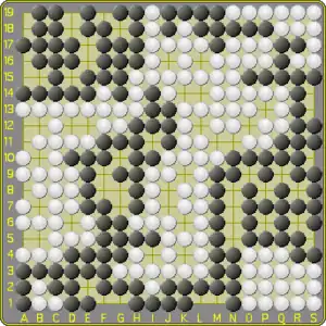 Symple is a two-player abstract strategy game created in 2010 by Christian Freeling and Benedikt Rosenau.[1][2] The goal of Symple is to end the game with the highest score, with score being determined via points for controlling territory on the board less a penalty for each separate group of stones. Like Go, Symple is played on a 19x19 grid of lines; unlike Go, there are no mechanics allowing capture of stones once placed. Symple is a drawless finite perfect information game.[3]