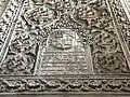 With the apparent approval of the king, ha-Levi defied the laws that required synagogues to be smaller and lower than churches and plain of decoration. The prayer hall is rectangular and measures 23 × 9.5 meters (roughly 75.5 feet × 29.5 feet) and has a 12-meter-high ceiling (close to 40 feet). The prayer hall features Nasrid-style polychrome stucco-work, multifoil arches, a massive Mudéjar artesonado ceiling, Hebrew inscriptions praising the king and ha-Levi himself, Arabic inscriptions, and quotations from the Psalms. The stucco-work, arches, and ceiling were made in the style of the Nasrid palace of Alhambra. There were also Christian elements in the architecture that mixed muqarnas ornament with heraldry and vegetal motifs that were common among Christian and Islamic buildings as well as in synagogues of the time. The ornamentation also bears the ha-Levi coat of arms, a borrowing of Christian architectural customs. Arabic inscriptions surround the prayer room and are intertwined with the floral patterns in the stucco. They are in Kufic-style script and include positive devotional affirmations and praises of God common in Islamic architecture. All along the prayer hall are large larchwood frames made with inlaid carved polychrome of ivory.[7]