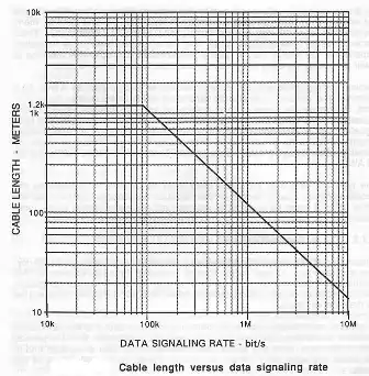 The relation between the cable length and clock frequency is shown in the following figure.[2] This can be used as a conservative guide. This curve is based upon empirical data using a 24 AWG Standard, copper conductor, unshielded twisted-pair telephone cable with a shunt capacitance of 52.5 pF/meter (16 pF/foot) terminated in a 100 Ohm resistive load. The cable length restriction shown by the curve is based upon assumed load signal quality requirements of: