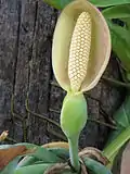 Its flowers are small, greenish or whitish on spadices within light-yellow through green spathes. However, the plants grown indoors do not bloom, aside from the older, well-cared-for specimens.