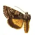 The wingspan is 34–36 mm. Adults are on wing from July to August depending on the location. There is one generation per year.