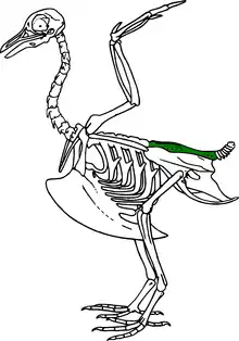The synsacrum is a skeletal structure of birds and other dinosaurs, in which the sacrum is extended by incorporation of additional fused or partially fused caudal or lumbar vertebrae and it can only be seen in birds. Some posterior thoracic vertebrae, the lumbar, sacral and a few anterior caudal vertebrae are fused to form a complex bone called synsacrum. The innominate bones are fused with the synsacrum to a greater or lesser extent, according to species, forming an avian pelvis. This forms a more extensive rigid structure than the pelvis of a mammal, fulfilling requirements for flight, locomotion and respiration. Posterior to the synsacrum there are a few free caudal vertebrae, the last of which is the pygostyle to which the long, stiff tail feathers are attached. The central section of the synsacrum is swollen to accommodate the glycogen body, an organ whose function is as yet unclear but which may be associated with balance.