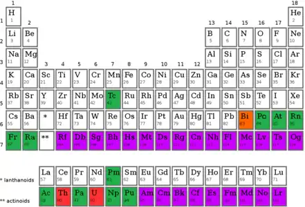 A synthetic element is one of 24 known chemical elements that do not occur naturally on Earth: they have been created by human manipulation of fundamental particles in a nuclear reactor, a particle accelerator, or the explosion of an atomic bomb; thus, they are called "synthetic", "artificial", or "man-made". The synthetic elements are those with atomic numbers 95–118, as shown in purple on the accompanying periodic table:[1] these 24 elements were first created between 1944 and 2010. The mechanism for the creation of a synthetic element is to force additional protons onto the nucleus of an element with an atomic number lower than 95. All synthetic elements are unstable, but they decay at widely varying rates: their half-lives range from a few hundred microseconds to millions of years.