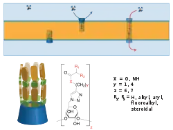The first synthetic ion channel was constructed by partial substitution on the primary rim of β-cyclodextrin.[7] Other substituted β-cyclodextrins have since been reported, including thiol-modified cyclodextrins,[20] an anion-selective oligobutylene channel,[21] and various poly-ethyleneoxide linked starburst oligomers.[22] Structure-activity relationships for a large suite of cyclodextrin "half-channels" prepared by "click"-chemistry has been recently reported.[17]