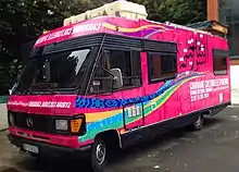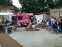 On its initiation, the project was self-financed. Participating artists paid a subscription, making it possible to fund the caravan and the journey costs.[69] Donations organised by the caravan's network also accounted for a big part of the budget.[70] Families and friends of the caravan's members played an important role by hosting the participants and contributing to the expenses of the trip. The caravan's success in 2014 allowed it to develop partnerships with various organisations.