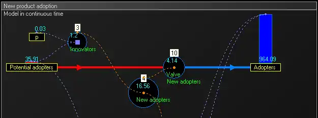 In our example, there are two stocks: Potential adopters and Adopters. There is one flow: New adopters. For every new adopter, the stock of potential adopters declines by one, and the stock of adopters increases by one.