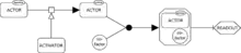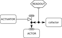 The SBGN Activity Flow (AF) language depicts the flow of information between biochemical entities in a network. It omits information about the state transitions of entities and is particularly convenient for representing the effects of perturbations, whether genetic or environmental in nature.[6]