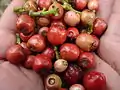 The 7–12 mm diameter fruits are ovoid with a concave tip and a wrinkled texture. The fruits turn purplish upon ripening.