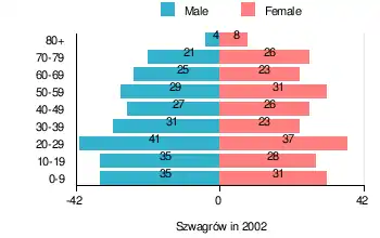 According to the 2002 Poland census, there were 483 people residing in Szwagrów village, of whom 51.8% were male and 48.2% were female. In the village, the population was spread out, with 23.4% under the age of 18, 35.9% from 18 to 44, 21.9% from 45 to 64, and 18.8% who were 65 years of age or older.[2]