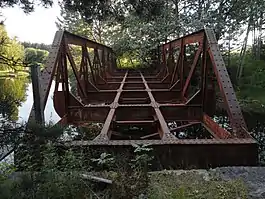 On the concurrent section the line crossed a creek on the 20-meter (66 ft) Sundbyfoss Bridge and immediately afterwards reached Sundbyfoss Station(36.75 km [22.84 mi]). The concurrency ended at Hof Station (39.00 km [24.23 mi]), which was the highest station at 68.2 meters (224 ft) AMSL. TEB continued down to Kopstad Station (42.20 km [26.22 mi]), past a spur to Hoff Sag & Høvleri, past Stubben Station (45.40 km [28.21 mi]) to Eidsfoss Station (48.10 km [29.89 mi]).[3]