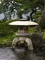This lantern is just a small stone box with a low roof. Its name, "Three Lights Lantern" is due to its windows, shaped like the sun and the moon in the front and rear, and like a star at the ends.[12] This type of lanterns is usually placed near water. It can be found in the garden of the Katsura Villa.