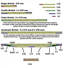 The use of Kato track created an early "informal" standard for the length of track on a module to be 310mm (which is 12.2"). A module of this size is typically referred to as a "single". A module with 620mm of track is referred to as a "double". Those with 930mm of track (3 x 310mm) are known as "triples" and, there are "quads" (4 x 310mm) and even longer T-TRAK modules for special situations. It is advisable that all track on straight modules be built as a multiple of 310mm units of track for reasons of compatibility. The reason this is advised is because most T-TRAK layouts consist of a double row of modules on a table and a non-standard length module on one side will not permit the loop to be closed. In order for a non-standard length module to be used, another module of equal length must be built and used on the other side of the table, or the layout must be constructed as a single row of modules with return loops on each end. While a non-standard length T-TRAK module can be constructed, the builder should recognize that doing so may limit the usability of that module in a multi-person, multi-club layout.