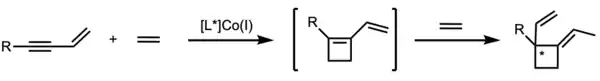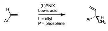 RajanBabu developed methodology surrounding C-C bond formation via metal-catalyzed hydroformylation. They reported several asymmetric examples through the usage of chiral phosphine ligand with a hemilabile coordinating group.[5][6] This method was applicable using vinylarenes, 1,3-dienes[7] and strained olefins as substrates. Applications of this chemistry include a new synthesis of (S)-ibuprofen[8] and a new approach to controlling the exocyclic side-chain stereochemistry in helioporin D[9] and pseudopterocins.[10] Related to this methodology, RajanBabu also developed a tandem [2+2] cycloaddition/asymmetric hydrovinylation reaction to allow conversion of simple precursors (ethylene, enynes) to structurally complex cyclobutanes.[11]