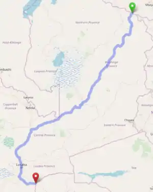 From Kapiri Mposhi, the road goes for 60 km (37 mi) south-south-west, through the Manyumbi Toll Plaza,[3] to the city of Kabwe, which is Central Province's Capital and home to the Mulungushi Rock of Authority. From Kabwe, the road goes 55 km (34 mi) south-west to the town of Chibombo.