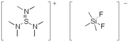 The cation [((CH3)2N)3S]+ is a sulfonium ion. The S-N distances are 1.612 and 1.675 pm. The N-S-N angles are 99.6°. The anion is [F2Si(CH3)3]−. It is trigonal bipyramidal with mutually trans fluorides. The Si-F distances are 176 picometers. The Si-C distances are 188 pm.[2]