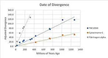 TBC1D30 has a large amount of orthologs. Analysis of these homologs allow us to ascertain the most important amino acids, i.e., the ones that are conserved. The most highly conserved amino acids among vertebrates, invertebrates, fungi, plants, bacteria and protists with available sequences were trp236, arg255, trp259, ile297, asp300, arg303, thr304, leu321, leu325, ala327, gly336, tyr337, cys338, gln339, leu349, glu356, pro399, trp432, trp450, asp451, arg463, and leu466.[22][23] The RabGAP domain within the gene originated approximately 4 billion years ago, as it is present within Terriglobus roseus,[24] which is an acidobacterium that diverged from humans 4.09 billion years ago.[25] The whole gene likely originated approximately 1.3 billion years ago, as there are still amino acids conserved past the RabGAP domain, and into the DUF4682 domain for Lithospermum erythrorhizon and Nicotiana attenuata.[24] These two plants diverged from humans about 1.275 billions years ago. [25]