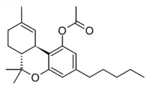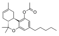 THC acetate ester can be synthesized from THC,[1][2] or from THCA. The acetylation of THC does not change the properties of the compound to the same extent as with other acetate esters, as the parent compound (THC) is already highly lipophilic, but potency is nonetheless increased to some extent. This derivative of THC is notable in that it is one of the few analogues of THC to have been encountered as a recreational drug sold and used in a highly pure smokable form. While the acetate ester of delta-9-THC is the best studied, the acetate esters of other isomers, especially delta-8-THC but also delta-10-THC are also known, as are other esters such as THC-O-phosphate, THC hemisuccinate and THC morpholinylbutyrate. Strangely, a minority of users have reported a pseudo-dissociative effect not found in any other isomer of THC.