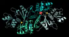 The homotetrameric tRNA-intron lyase, α4, only found in Methanocaldococcus jannaschii, takes on a rectangular parallelepiped conformation consisting of four α subunits of 179 amino acids each.[6] Each α subunit is made up of five α helices and mixed β sheets. The homodimeric tRNA-intron lyase, α′2 is composed of two α′ subunits that appear to be a fusion protein made up of two α subunits connected by a linker.[8] The α′2 structure is only found in Archaeoglobus fulgidus and Thermoplasma acidophilum.[8] The heterotetramer (αβ)2 structure is found in Nanoarchaeum equitans, Pyrobaculum aerophilum, Aeropyrum pernix, and Methanopyrus kandleri.[9] This structure is composed of two catalytic α subunits and two structural β subunits, with similar function as both of the previously described structures.[9] The last structure, 𝜀2, is a homodimer found only in Candidatus Micrarchaeum acidiphilum.[6] Each subunit is composed of three smaller units: αN, α, and βC joined by two linkers.[6]