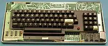 The graphics are displayed at a resolution of 64×16 character positions on a screen measuring 7.5 inches (19 cm) wide and 6.625 inches (16.83 cm) tall.[52] Each character is composed of a 2×3 matrix of pixels, and corresponds to one byte of the 1 KB video memory used by the TRS-80. In each of those bytes, the first six bits control which pixel is displayed. The seventh bit is ignored, and the eighth toggles graphics mode.[51][53] The reason that the seventh bit is ignored is due to the company's decision to have only seven 2102 static RAM chips installed on the computer's motherboard instead of eight to keep the manufacturing cost low.[54] Thus, there are no lowercase letters in the TRS-80 character set of an unmodified Model I, and the number of both graphics symbols and alphanumeric symbols is 64.[55] This can be worked around by deleting the unused bit and piggybacking an eighth 2102 chip onto another.[56] The alphanumeric symbols are displayed in 5×7 matrices of pixels.[51] The 1978 manual for the popular word processor Electric Pencil came with instructions for modifying the computer. Although the modification needs to be disabled for Level II BASIC, its design became the industry standard and was widely sold in kit form,[57] along with an eighth 2102 chip. Later models came with the hardware for the lowercase character set to be displayed with descenders.