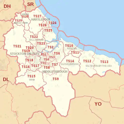 The TS postcode area, also known as the Cleveland postcode area,[2] (or unofficially as the Teesside postcode area) is a group of 29 postcode districts in north-east England for ten post towns. These cover north-east North Yorkshire (post towns Middlesbrough, Redcar, Saltburn-by-the-Sea, Guisborough and Yarm) and south-east County Durham (post towns Stockton-on-Tees, Hartlepool, Billingham, Wingate and Trimdon Station).