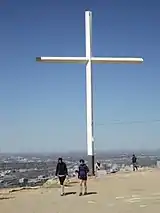 An illuminated sixty-foot (18 m) white cross[5] at its summit has been the subject of a lawsuit involving the separation of church and state (the cross itself stands on four square feet (0.4 m2) of land sold to the Jaycees for $100 in 1972, hence it stands on private property). The legality of the land sale to the Jaycees is disputed, as the land board meeting minutes, which discuss the sale, indicate that the sale was structured specifically to sell the land to the Jaycees for the purpose of insulating the cross from legal attack. The sale included language that allowed the Land Board to reject any offers, with the stated intent of rejecting offers other than from the Jaycees.
