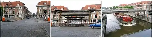 Three views of the Pont levant Notre-Dame on the Scheldt River at Tournai, Belgium