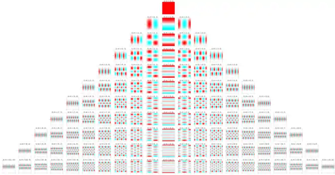 Below the real spherical harmonics are represented on 2D plots with the azimuthal angle, , on the horizontal axis and the polar angle, , on the vertical axis. The saturation of the color at any point represents the magnitude of the spherical harmonic and the hue represents the phase.