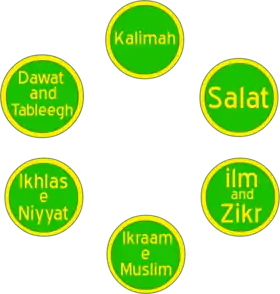 Established in 1926 by the Muhammad Ilyas al-Kandhlawi, in the Mewat region of India, it has roots in the Deobandi reformist tradition,[4] and developed as a response to the perceived deterioration of moral values and the supposed neglect of aspects of Islam.[2] The movement aims for the spiritual reformation of Islam by working at the grassroots level.[9][13] The teachings of Tabligh Jamaat are expressed in "Six Principles": Kalimah (Declaration of faith), Salah (Prayer), Ilm-o-zikr (Reading and Remembrance), Ikraam-e-Muslim (Respect for Muslims), Ikhlas-e-Niyyat (Sincerity of intention), and Dawat-o-Tableegh (Proselytizaton).[14]