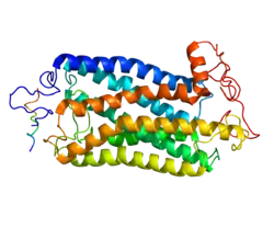 Tachykinin NK1 receptor[9] consists of 407 amino acid residues, and it has a molecular weight of 58,000.[6][10] NK1 receptor, as well as the other tachykinin receptors, is made of seven hydrophobic transmembrane (TM) domains with three extracellular and three intracellular loops, an amino-terminus and a cytoplasmic carboxy-terminus. The loops have functional sites, including two cysteines amino acids for a disulfide bridge, Asp-Arg-Tyr, which is responsible for association with arrestin and, Lys/Arg-Lys/Arg-X-X-Lys/Arg, which interacts with G-proteins.[9][10]