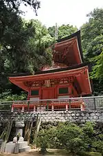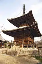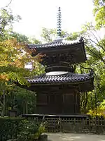 A tahōtō (多宝塔, lit. many-jewelled pagoda) is a form of Japanese pagoda found primarily at Esoteric Shingon and Tendai school Buddhist temples. It is unique among pagodas because it has an even number of stories (two). (The second story has a balustrade and seems habitable, but is nonetheless inaccessible and offers no usable space.)[1] Its name alludes to Tahō Nyorai, who appears seated in a many-jewelled pagoda in the eleventh chapter of the Lotus Sutra.[2][3] With square lower and cylindrical upper parts, a mokoshi 'skirt roof', a pyramidal roof, and a finial, the tahōtō or the larger daitō was one of the seven halls of a Shingon temple.[4] After the Heian period, the construction of pagodas in general declined, and new tahōtō became rare. Six examples, of which that at Ishiyama-dera (1194) is the earliest, have been designated National Treasures.[5] There are no examples in China, whether architectural or pictoral, of anything that resembles the tahōtō, although there is a Song dynasty textual reference to a 'tahōtō with an encircling chamber'.[6]