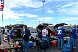 A tailgate party is a social event held on and around the open tailgate of a vehicle. Tailgating, which primarily takes place in the United States and Canada, often involves consuming alcoholic beverages and grilling food. Tailgate parties occur in the parking lots at stadiums and arenas, before and occasionally after games and concerts. People attending such a party are said to be 'tailgating'. Many people participate even if their vehicles do not have tailgates. Tailgate parties also involve people bringing their own alcoholic beverages, barbecues, food etc. which is sampled and shared among fans attending the tailgate. Tailgates are intended to be non-commercial events, so selling items to the fans is frowned upon. Tailgating is often seen as a critical part of the sports experience in the United States. Because many American sports venues are surrounded by large parking lots, tailgating often takes place right outside stadium and arena entrances.
