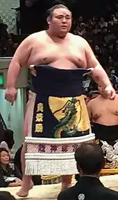 In Takakeishō's top division debut he only managed a 7–8 record.[6] However, he followed up with eleven wins against four losses in the March 2017 tournament and was awarded his first special prize, for Fighting Spirit. Another 11–4 record in May saw him promoted to maegashira 1, but he struggled at his new rank and recorded only five wins in July. Ranked at maegashira 5 in September 2017, he earned his first kinboshi or victory over a yokozuna by defeating Harumafuji,[8] who went on to win the tournament. Takakeishō was awarded the Outstanding Performance Prize on the final day. In November he again recorded eleven wins, earning two further kinboshi with victories over Harumafuji and Kisenosato and receiving a second consecutive prize for Outstanding Performance.[9]