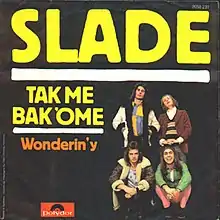 "Take Me Bak 'Ome" is a song by the British rock band Slade, released in 1972 as a non-album single. It was written by lead vocalist Noddy Holder and bassist Jim Lea, and produced by Chas Chandler. It reached No. 1 in the UK, giving the band their second number one single, and remained in the charts for thirteen weeks.[2] The song was certified UK Silver by BPI in 1972.[3][4] In the United States, the song reached No. 97.[5] The song would be included on the band's 1973 compilation album Sladest.[6]