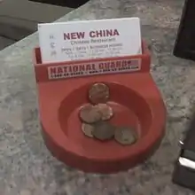 The small cup or tray near a cash register is designated as a place for people to place pennies they receive as change if they do not want these pennies. Then, customers who, for example, need one cent for a transaction can take one of the pennies to avoid needing one of their own or breaking a higher-denomination coin or bill. The tray can also be used by cashiers for the sake of efficiency: the cashier may take a penny (1 cent) from the tray and then give the customer, for example, one quarter (25 cents) instead of 24 cents (two dimes and four pennies, or six coins in all).[1] These are also called "penny pools", and may be either a generic container such as a small box, or a purposely made container, perhaps with an advertisement or with text advising the customer to "take a penny, leave a penny".[2]