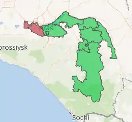 Takhtamukaysky District (Russian: Тахтамука́йский райо́н; Adyghe: Тэхъутэмыкъуае къедзыгъо) is an administrative[1] and a municipal[9] district (raion), one of the seven in the Republic of Adygea, Russia. It is located in the west of the republic and borders with Krasnoarmeysky District of Krasnodar Krai and with the territory of the City of Krasnodar in the north, Teuchezhsky District in the east, the territory of the Town of Goryachy Klyuch of Krasnodar Krai in the south, and with Seversky District of Krasnodar Krai in the south and west. The area of the district is 463.6 square kilometers (179.0 sq mi).[4] Its administrative center is the rural locality (an aul) of Takhtamukay.[1] As of the 2010 Census, the total population of the district was 69,662, with the population of Takhtamukay accounting for 7.5% of that number.[5]