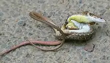 Takydromus tachydromoides, the Japanese grass lizard, is a wall lizard species of the genus Takydromus. It is found in Japan. Its Japanese name is 'kanahebi' (カナヘビ). 'Hebi' means 'snake' in Japanese, although this lizard is not a snake. There are three lizards found in the four main islands of Japan. The other two are the Japanese gekko (also, Schlegel's Japanese gekko, Gekko japonicus), and the Japanese five-lined skink (Eumeces latiscutatus, also Plestiodon latiscutatus; this skink shows five lines only as a juvenile).[1]