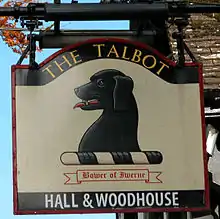 "The Talbot" (or "Talbot Arms") is most familiar as a name of English public houses or inns and is usually depicted on the signs as a large white hound with hanging ears, sometimes with spots. Heraldic inn signs usually displayed the arms or heraldic badges of the lord of the manor in which they were situated, who was probably the owner of the freehold interest, together with that of most other houses in the village.[12] As the Talbot family possessed countless manors throughout England, the sign would have been well-known. Such signs helped to identify the inn for the illiterate. An inn called The Talbot in Iwerne Minster, Dorset, U.K., showed as its sign a black dog, apparently the crest of the Bower family, who owned the manor from the late Middle Ages till 1876.[13] The "Talbot Inn" in Mells, Somerset is an allusion to the arms of the Horner family of Mells Manor: Sable, three talbots argent, the arms being possibly a play on the surname as hunting hounds are controlled by the blowing of horns.