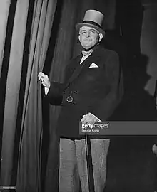 ![]() Talbot O'Farrell, ready to go on stage at the 1948 Royal Variety Performance, in his characteristic dress with top hat, cane, and monocle | |