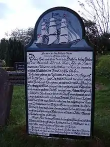The Talking Gravestones (German: Sprechende Grabsteine) of Föhr, also known as the Story-telling Gravestones (Erzählende Grabsteine), are historic artifacts on the German island of Föhr. They can be found in the cemeteries of St. Laurentii church in Süderende (54.7163°N 8.4352°E), St. Johannes church in Nieblum (54.6934°N 8.4911°E), and St. Nikolai church in Boldixum (54.6958°N 8.5504°E), which is now a district of Wyk auf Föhr. Similar objects are known from the neighbour island of Amrum.[1] All such headstones made until 1870 are designated cultural heritage monuments.[2] Their inscriptions tell the biographies of the deceased including their private and professional lives, extraordinary events, and honorary appointments.[3] With 265 monuments, the St. Johannis cemetery has the largest inventory of historical gravestones in Nordfriesland district.[4] The best-known tombstone is the one of Matthias Petersen who was a very successful whaling captain and was therefore dubbed "Lucky Matthew" (der glückliche Matthias).[5] The only ornamental decoration on this stone is a circular relief depicting the goddess of fortune upon a swimming whale in the style of a coat of arms. It features the only inscription completely in Latin language in the cemetery of Süderende, which relates that Petersen who died in 1706 caught 373 whales during his lifetime.[6]