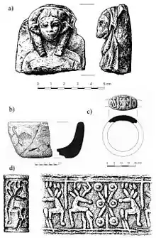 - Casemate wall, tower with sanctuary, gate, water channels, three residential buildings, two monumental representative building with a hoard of 23+5 cylinder seals, silver pendant, scarabs, beads etc. - Excavation