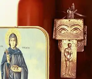 Tamata may be bought in shops selling Greek Orthodox religious items, and then hung with a ribbon on a pole or hooks near an icon or shrine of a saint, the act of which is usually accompanied with a prayer, and sometimes with the lighting of a votive candle. The destinations of pilgrimages often include shrines decorated with many tamata.